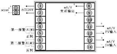 輸出方式為繼電器正反轉(zhuǎn)輸出,PV輸入類型為4~20