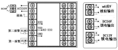 輸出方式 | 01234567 | 無控制輸出繼電器觸點電流 4~20mA電流 0~10mA電壓 1~5V電壓 0~5VSCR-過零觸發(fā)脈沖SSR-固態(tài)繼電器 | |||||||||
