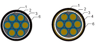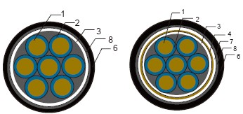 1導(dǎo)體 2絕緣 3包帶 4屏蔽 5填充 6外護(hù)套 7內(nèi)襯層 8鎧裝