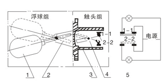 控制器由浮筒組與觸頭組二大部分組成。當(dāng)被測液位升高或降低時,浮筒(1)隨之升降,使其端部的磁鋼(2)上下擺動,通過磁力排斥安裝在外殼(3)內(nèi)相同磁極的磁鋼(4)上下擺動。其另一端的觸頭(5)便在靜觸頭1-1,及2-2間連通或斷開,隨即在電路中的信號裝置發(fā)出光或聲的信號,或啟閉電動泵供液或收液。