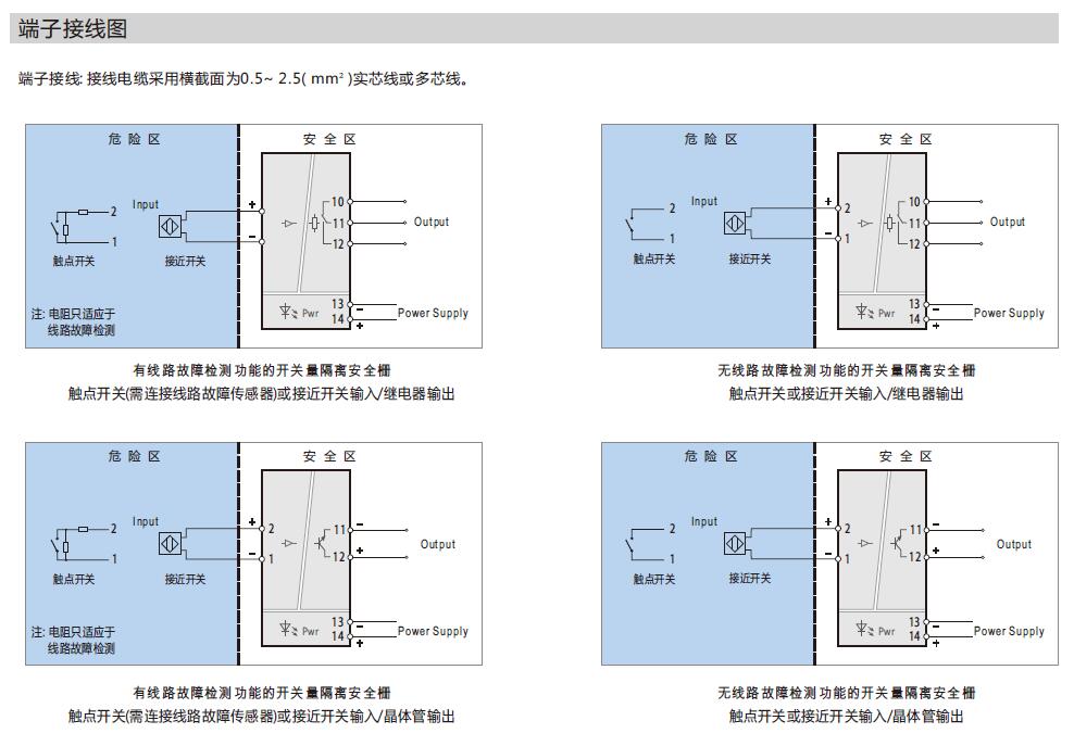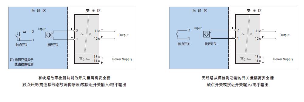 (說明: 當(dāng)用到線路檢測功能時,如果需要使用機(jī)械觸點開關(guān)作為輸入設(shè)備,必須在輸入回路中連接線路故障傳感器,以避免開關(guān)量隔離安全柵將機(jī)械觸點開關(guān)正常的通斷誤當(dāng)做輸入回路的斷路或短路故障。)