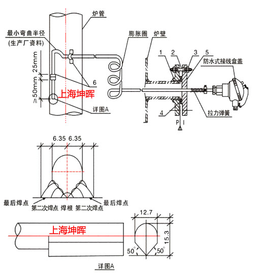 刀刃式、屏蔽刀刃式鎧裝熱電偶主要用于石化、電力、冶金、機械和食品工業(yè)中,加熱爐的爐壁及爐管溫度測量。它采用定位卡,將測量端的刀刃形熱電偶固定在爐壁等部位,通過測量端把感受到的溫度轉(zhuǎn)換成熱電勢信號,送至顯示和調(diào)節(jié)儀表進行控制。以保證加熱爐的安全運行。