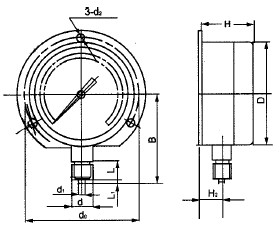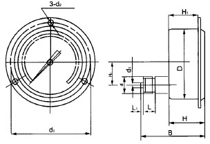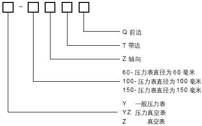 例:Y-100ZTQ 0~1MPa直徑為100毫米,軸向帶前邊 測壓范圍0~1MPa的真空壓力表