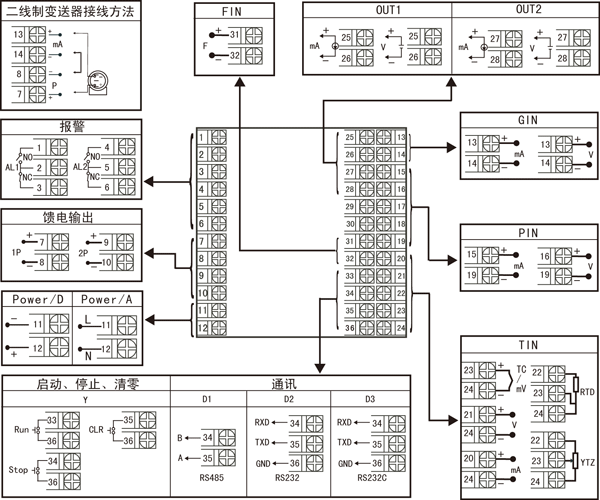 | X D1 D2 D3 Y | 無輸出 RS-485通迅接口(Modbus) RS232通迅接口(Modbus) RS232C打印接口 啟動、停止、清零 | ||