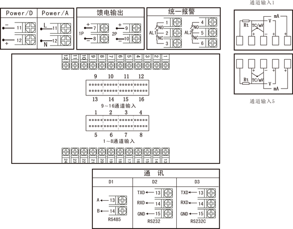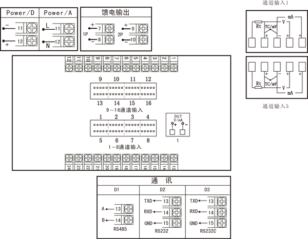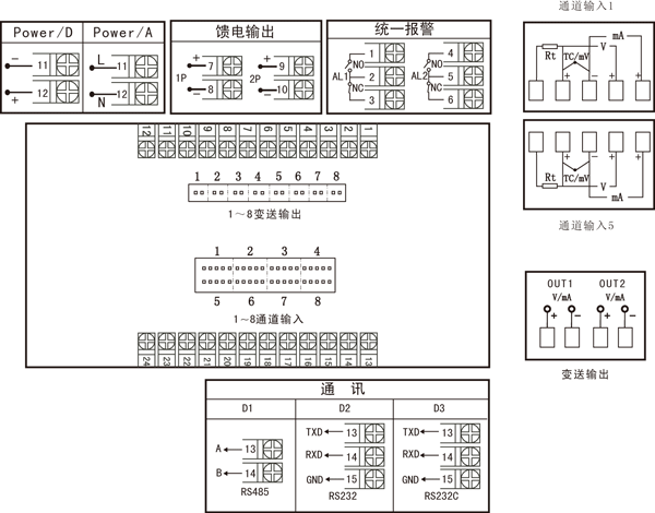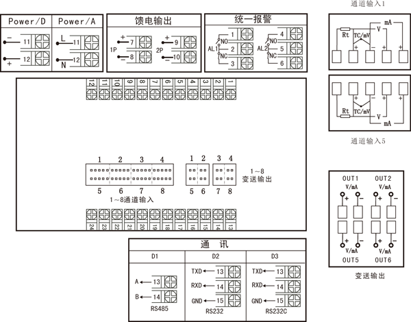 | 注:統(tǒng)一變送輸出的接線端子在1號輸出端子上。 |