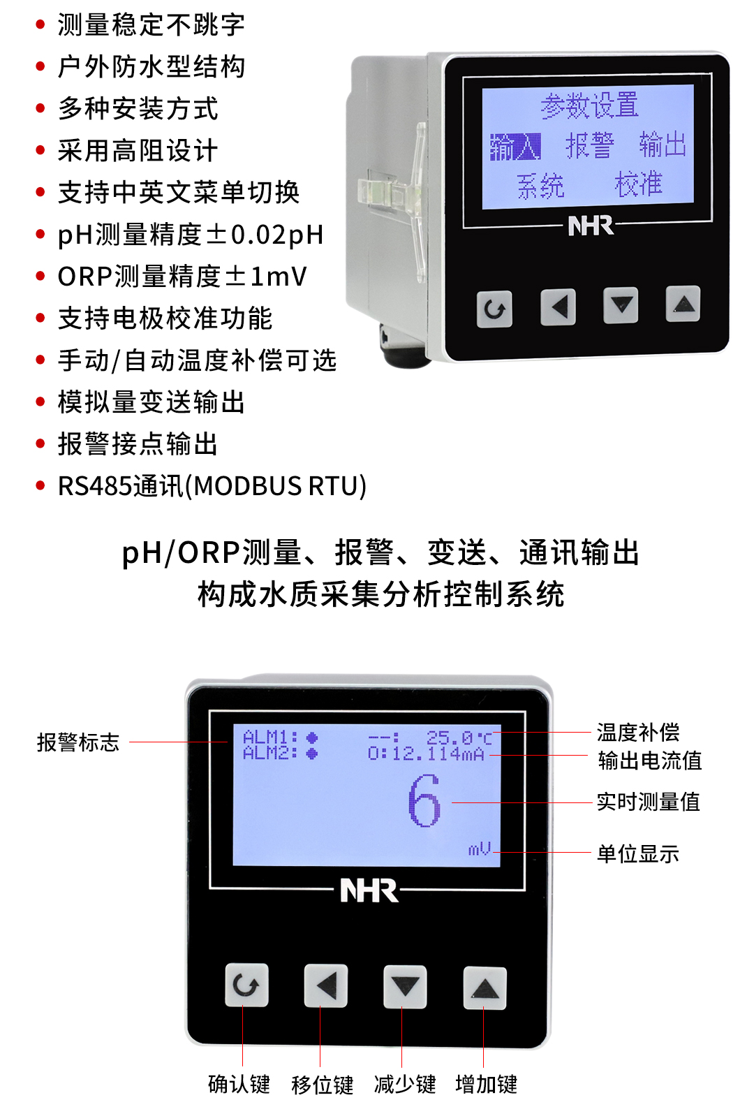 NHR-PH10系列pH/ORP在線監(jiān)測(cè)儀是一款智能在線化學(xué)分析儀器(酸度計(jì)、pH計(jì)、pH酸度計(jì)、酸度計(jì)phs-25),具備一路RS485通訊輸出、一路模擬信號(hào)輸出和兩路繼電器報(bào)警輸出。
