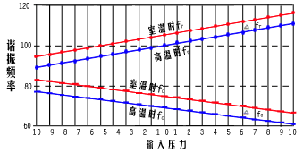 當(dāng)加有靜壓(工作壓力)時(shí),兩形狀、尺寸、材質(zhì)完全一致的諧振梁形變相同, 故頻率變化也一致,故偏差自動(dòng)清除(公式和圖類似溫度影響)。