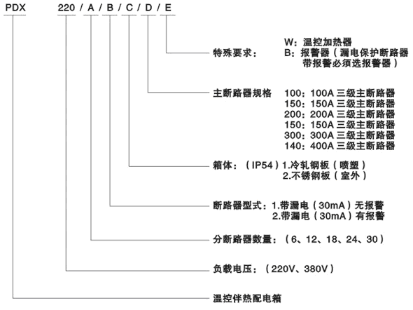 PDX配電箱是用于伴熱電纜電伴熱的標準配電箱,采用掛式活落地式箱體結構,電源電纜進口在箱體底部,防護等級IP54,內(nèi)裝有主斷路器。分路漏電保護斷路器,也可根據(jù)特別需要,配報警裝置及溫控器。1、標準箱